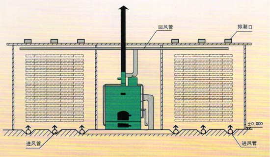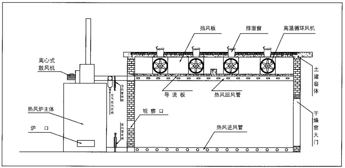 熱風(fēng)式干燥設(shè)備工作原理是利用燃燒產(chǎn)生的熱能,加熱窯內(nèi)的空氣,由熱風(fēng)爐頂部主風(fēng)機將窯內(nèi)的空氣通過管道吸入爐體,將空氣加熱。再通過管道,送入窯內(nèi),由窯內(nèi)的循環(huán)風(fēng)機不斷的循環(huán)對窯內(nèi)的木材均勻加熱。木材干燥過程中如需要蒸汽,可由熱風(fēng)爐內(nèi)的蒸汽發(fā)生器提供,如果是一爐兩房或多房時,管道上裝有插閥,通過插閥的調(diào)節(jié)來控制窯內(nèi)的溫度。在干燥的過程中,由于木材要進(jìn)行排濕,在窯頂上留有排濕孔(根據(jù)地區(qū)而定)和裝有抽濕機,用來調(diào)節(jié)排濕的快慢.