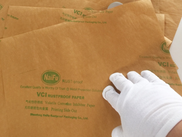 4、包裝過程---將含有緩蝕劑的面朝向金屬包裝,不覆膜防銹紙可作為金屬產(chǎn)品間墊層隔材使用,以免其他材質(zhì)阻隔材料含S、CL化學成分,影響防銹效果